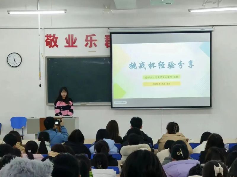 紧接着由马克思主义学院张赫同学分享挑战杯宝贵经验。她首先介绍了挑战杯的概况以及各类竞赛项目,主要对如何参与比赛和材料的申报等一系列流程进行讲解,提出同学们需要具有组织协调能力,逻辑思维能力去应对比赛过程中的各类问题,针对竞赛主题立意和正确选材方面进行详细说明,让同学们进一步体会到创新精神,鼓励同学们加强交流,互相合作,更好去创立项目,完成作品和答辩。