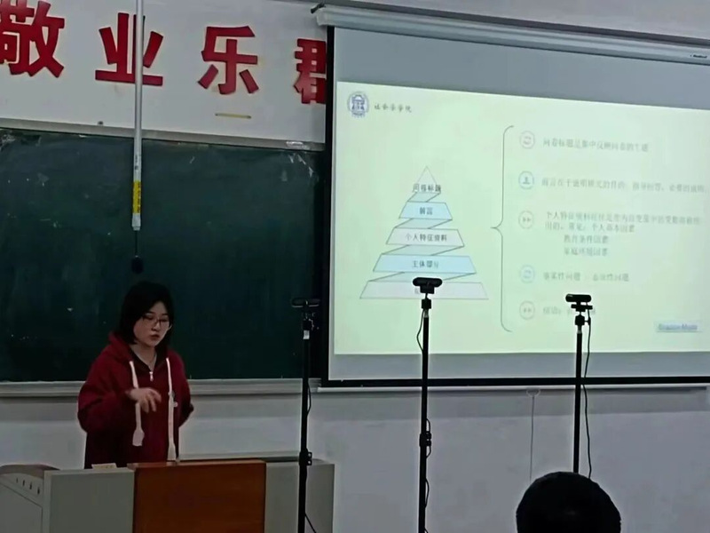 最后,社会学学院付小梦同学提供了定量与定性两个方面的调查研究思路。其中定量研究分为研究目的、主体抽样、问卷设计等,为大家提供了研究方法,之后她强调了问卷设计中的信度与效度、数据分析等问题。定性研究从访谈调查和问题内容设计等方面提供了建议和方法,另外从“自愿参与”、“匿名”、“保密”等方面强调在进行社会调查时的注意事项,以减少调查时出现的问题。