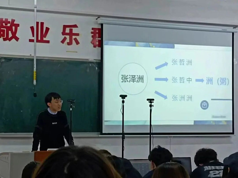 接下来由文学院的张泽洲同学分享自己的创新创业经验,他以风趣幽默的语言与大家互动,循循善诱,谈论关于创新创业的含义,带着一种研究思维,积极发现问题、研究问题、提供产品或服务去解决问题。接着他建议从课题申报指南、现实数据、文献研究报告等方面去选题,强调要根据自身专业与特色不断缩小范围,精准研究。